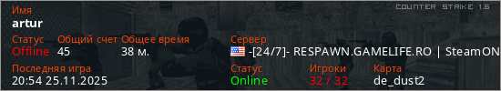 Играет на Counter Strike 1.6 сервере. Страна: СШАПервый раз замечен 03:14 15.03.2025