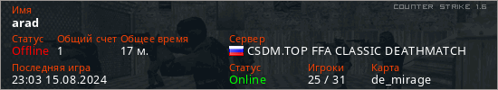 Играет на Counter Strike 1.6 сервере. Страна: РоссияПервый раз замечен 22:42 01.05.2024