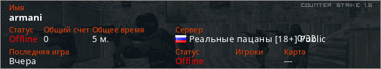 Играет на Counter Strike 1.6 сервере. Страна: РоссияПервый раз замечен 21:07 03.03.2026