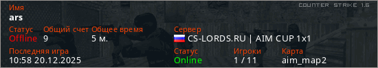 Играет на Counter Strike 1.6 сервере. Страна: РоссияПервый раз замечен 10:56 20.12.2025