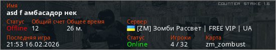 Играет на Counter Strike 1.6 сервере. Страна: УкраинаПервый раз замечен 19:44 16.02.2026