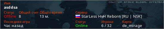 Играет на Counter Strike Global Offensive сервере. Страна: РоссияПервый раз замечен 20:01 13.12.2025