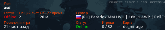 Играет на Counter Strike Global Offensive сервере. Страна: РоссияПервый раз замечен 23:52 09.01.2026