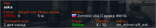 Играет на Counter Strike Source сервере. Страна: РоссияПервый раз замечен 14:18 25.03.2026