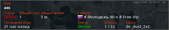Играет на Counter Strike 1.6 сервере. Страна: РоссияПервый раз замечен 19:01 04.12.2025