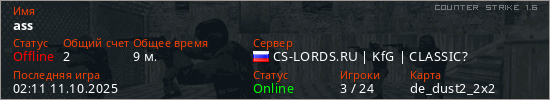 Играет на Counter Strike 1.6 сервере. Страна: РоссияПервый раз замечен 13:27 11.04.2025