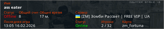 Играет на Counter Strike 1.6 сервере. Страна: УкраинаПервый раз замечен 12:01 16.02.2026