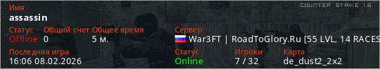 Играет на Counter Strike 1.6 сервере. Страна: РоссияПервый раз замечен 15:52 08.02.2026