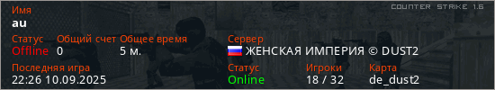 Играет на Counter Strike 1.6 сервере. Страна: РоссияПервый раз замечен 22:22 10.09.2025