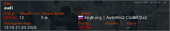 Играет на Counter Strike 1.6 сервере. Страна: РоссияПервый раз замечен 13:14 21.03.2026