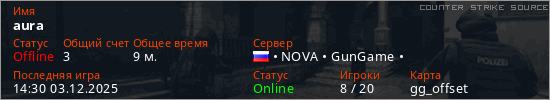 Играет на Counter Strike Source сервере. Страна: РоссияПервый раз замечен 13:35 03.12.2025