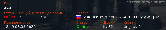 Играет на Counter Strike Source сервере. Страна: РоссияПервый раз замечен 18:45 03.03.2026