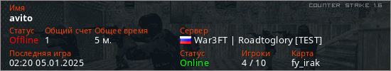 Играет на Counter Strike 1.6 сервере. Страна: РоссияПервый раз замечен 02:18 05.01.2025
