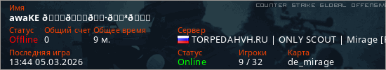 Играет на Counter Strike Global Offensive сервере. Страна: РоссияПервый раз замечен 11:43 05.03.2026