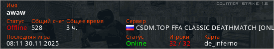 Играет на Counter Strike 1.6 сервере. Страна: РоссияПервый раз замечен 05:12 25.06.2020