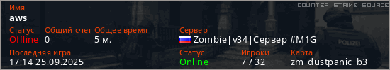 Играет на Counter Strike Source сервере. Страна: РоссияПервый раз замечен 17:12 25.09.2025