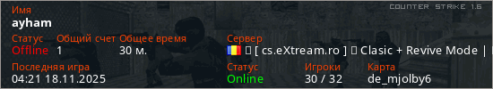 Играет на Counter Strike 1.6 сервере. Страна: РумынияПервый раз замечен 20:06 17.05.2025