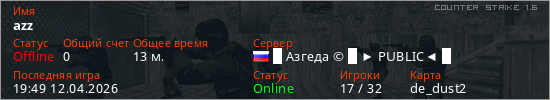 Играет на Counter Strike 1.6 сервере. Страна: РоссияПервый раз замечен 12:37 04.04.2026