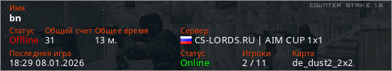 Играет на Counter Strike 1.6 сервере. Страна: РоссияПервый раз замечен 05:36 08.01.2026