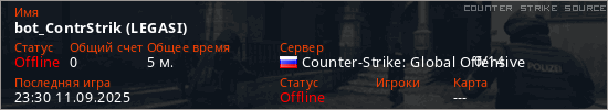 Играет на Counter Strike Source сервере. Страна: РоссияПервый раз замечен 23:18 11.09.2025