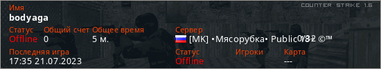 Играет на Counter Strike 1.6 сервере. Страна: РоссияПервый раз замечен 17:33 21.07.2023