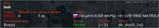 Играет на Counter Strike 1.6 сервере. Страна: РоссияПервый раз замечен 18:35 22.12.2025