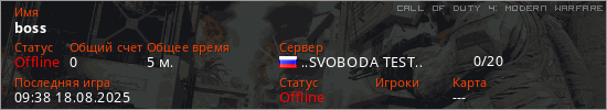 Играет на Call of Duty 4: Modern Warfare сервере. Страна: РоссияПервый раз замечен 09:28 18.08.2025