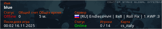 Играет на Counter Strike Global Offensive сервере. Страна: РоссияПервый раз замечен 00:00 16.11.2025