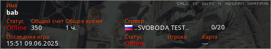 Играет на Call of Duty 4: Modern Warfare сервере. Страна: РоссияПервый раз замечен 21:52 20.04.2025