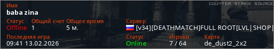 Играет на Counter Strike Source сервере. Страна: РоссияПервый раз замечен 09:24 13.02.2026