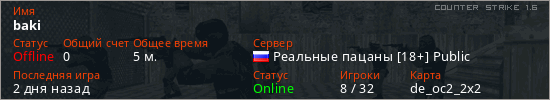 Играет на Counter Strike 1.6 сервере. Страна: РоссияПервый раз замечен 17:06 16.02.2026