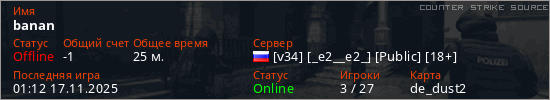 Играет на Counter Strike Source сервере. Страна: РоссияПервый раз замечен 20:33 07.07.2025