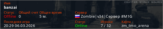 Играет на Counter Strike Source сервере. Страна: РоссияПервый раз замечен 20:27 06.03.2026