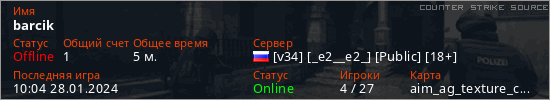 Играет на Counter Strike Source сервере. Страна: РоссияПервый раз замечен 09:49 28.01.2024