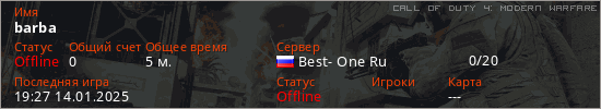 Играет на Call of Duty 4: Modern Warfare сервере. Страна: РоссияПервый раз замечен 19:25 14.01.2025