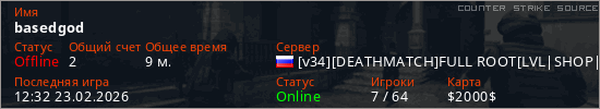 Играет на Counter Strike Source сервере. Страна: РоссияПервый раз замечен 12:17 23.02.2026