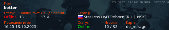 Играет на Counter Strike Global Offensive сервере. Страна: РоссияПервый раз замечен 13:52 12.10.2025