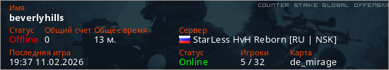Играет на Counter Strike Global Offensive сервере. Страна: РоссияПервый раз замечен 16:09 11.02.2026