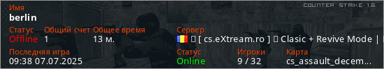 Играет на Counter Strike 1.6 сервере. Страна: РумынияПервый раз замечен 17:33 06.07.2025