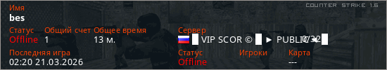 Играет на Counter Strike 1.6 сервере. Страна: РоссияПервый раз замечен 12:33 13.03.2026