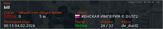 Играет на Counter Strike 1.6 сервере. Страна: РоссияПервый раз замечен 00:02 04.02.2026