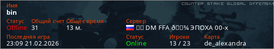 Играет на Counter Strike Global Offensive сервере. Страна: РоссияПервый раз замечен 22:36 21.02.2026