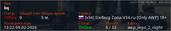 Играет на Counter Strike Source сервере. Страна: РоссияПервый раз замечен 13:20 09.02.2026