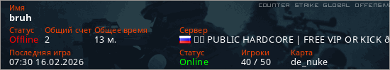 Играет на Counter Strike Global Offensive сервере. Страна: РоссияПервый раз замечен 23:47 18.04.2025