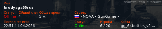 Играет на Counter Strike Source сервере. Страна: РоссияПервый раз замечен 22:45 11.04.2026