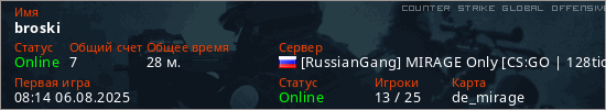 Играет на Counter Strike Global Offensive сервере. Страна: РоссияПервый раз замечен 08:14 06.08.2025