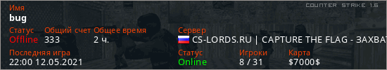 Играет на Counter Strike 1.6 сервере. Страна: РоссияПервый раз замечен 19:45 14.04.2021