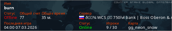 Играет на Counter Strike Global Offensive сервере. Страна: РоссияПервый раз замечен 03:19 07.03.2026