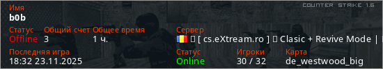 Играет на Counter Strike 1.6 сервере. Страна: РумынияПервый раз замечен 19:59 12.02.2025