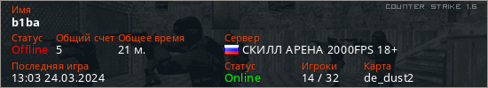 Играет на Counter Strike 1.6 сервере. Страна: РоссияПервый раз замечен 11:24 15.03.2024
